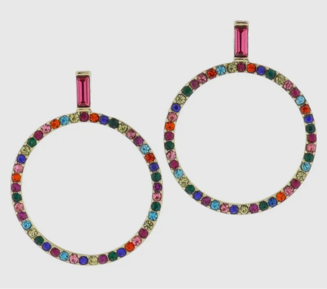 Add some bling to your party look with these 18 kt gold plated earrings. The pink baguette post and multi rhinestone circle are sure to catch the eye, making you the life of the party. Perfect for a night out with friends or a special occasion, these earrings will elevate any outfit.