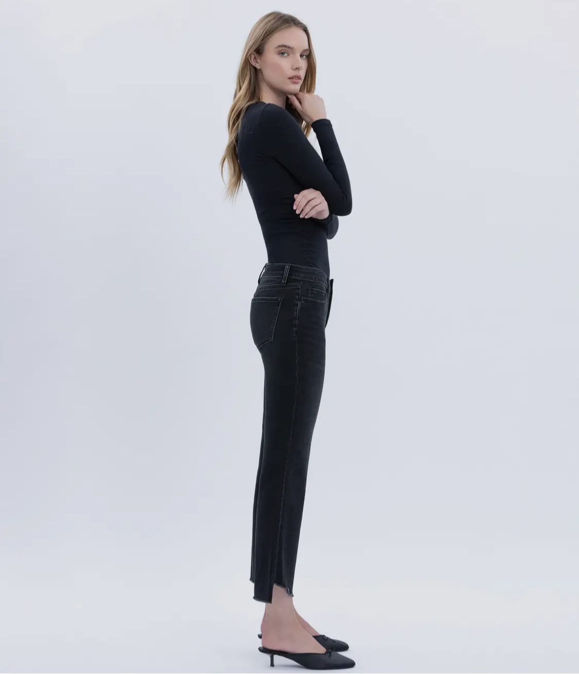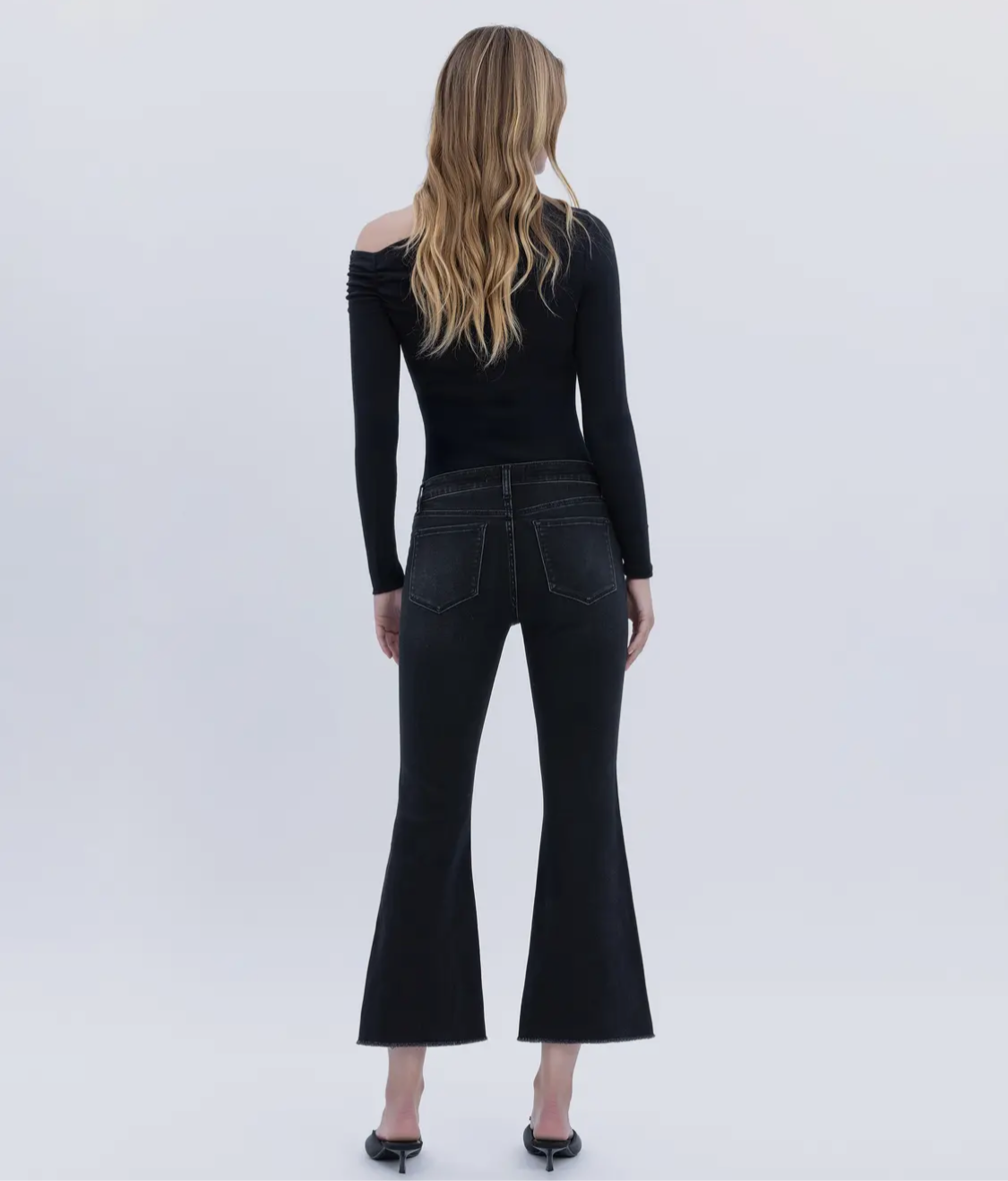 Upgrade your denim collection with our expertly designed Black Crop Flare Jeans. Made by Vervet, these stylish mid-rise jeans feature a raw step hem for a unique touch. Enhance your look with these high-quality jeans that are both fashionable and functional.
