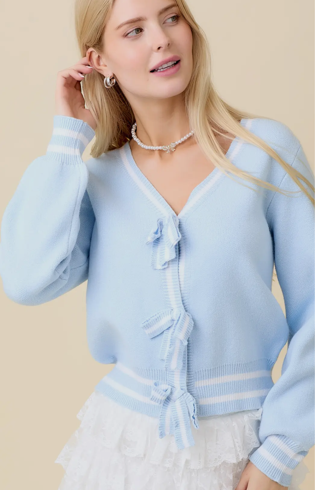 This baby blue sweater features delicate bows down the front and a collegiate style hem and cuffs, adding a touch of charm to any outfit. Made with high-quality materials, this sweater is soft and comfortable, perfect for any occasion.