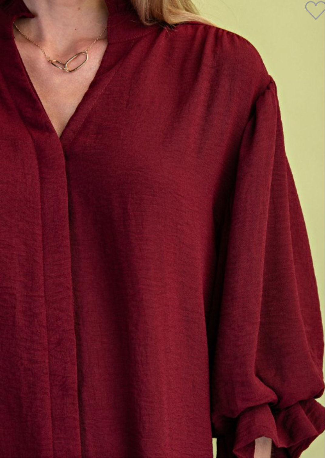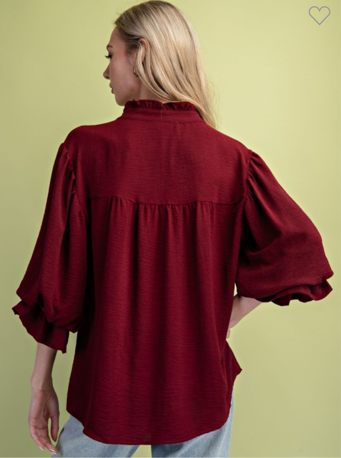 Get ready to spice up your wardrobe with our Burgundy 3/4 Balloon Sleeve Top! The 3/4 balloon sleeves, adorned with functional buttons, add a touch of whimsy to this classic piece. Stand out in style and comfort with this must-have top.