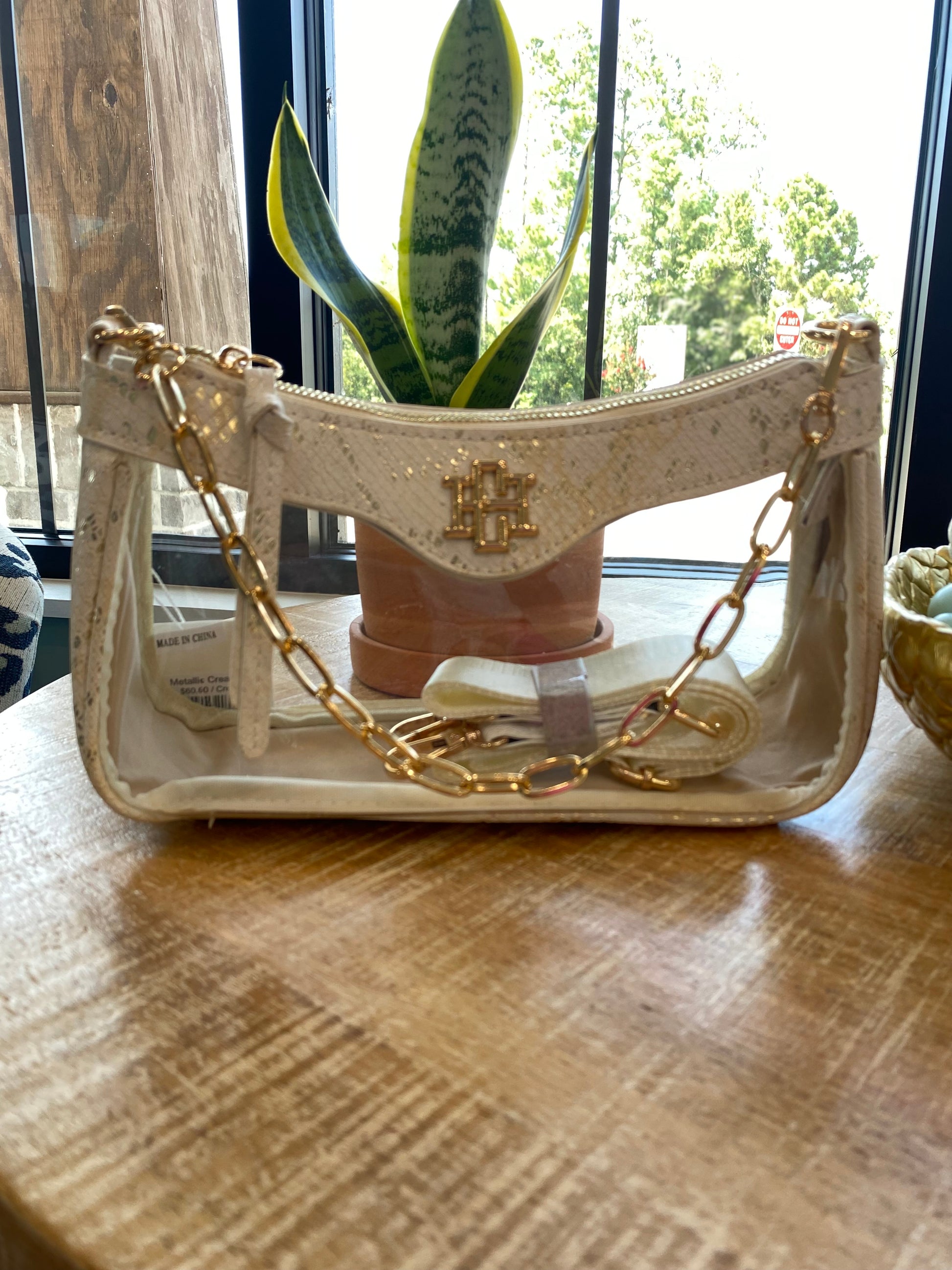 The Clear & Metallic Cream Crossbody is the perfect blend of fashion and function. Featuring a sleek clear design with a trendy snakeskin print, this crossbody bag is sure to elevate any outfit. The gold chain detail adds a touch of glamour, making it a versatile must-have accessory for any occasion, but can be especially perfect for gameday!