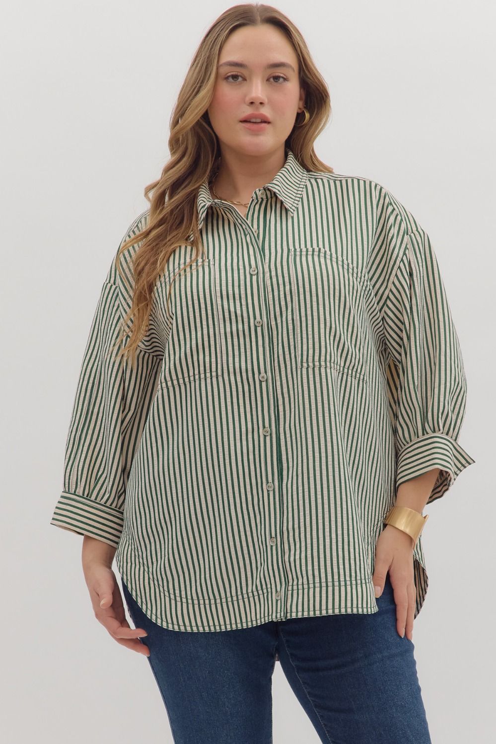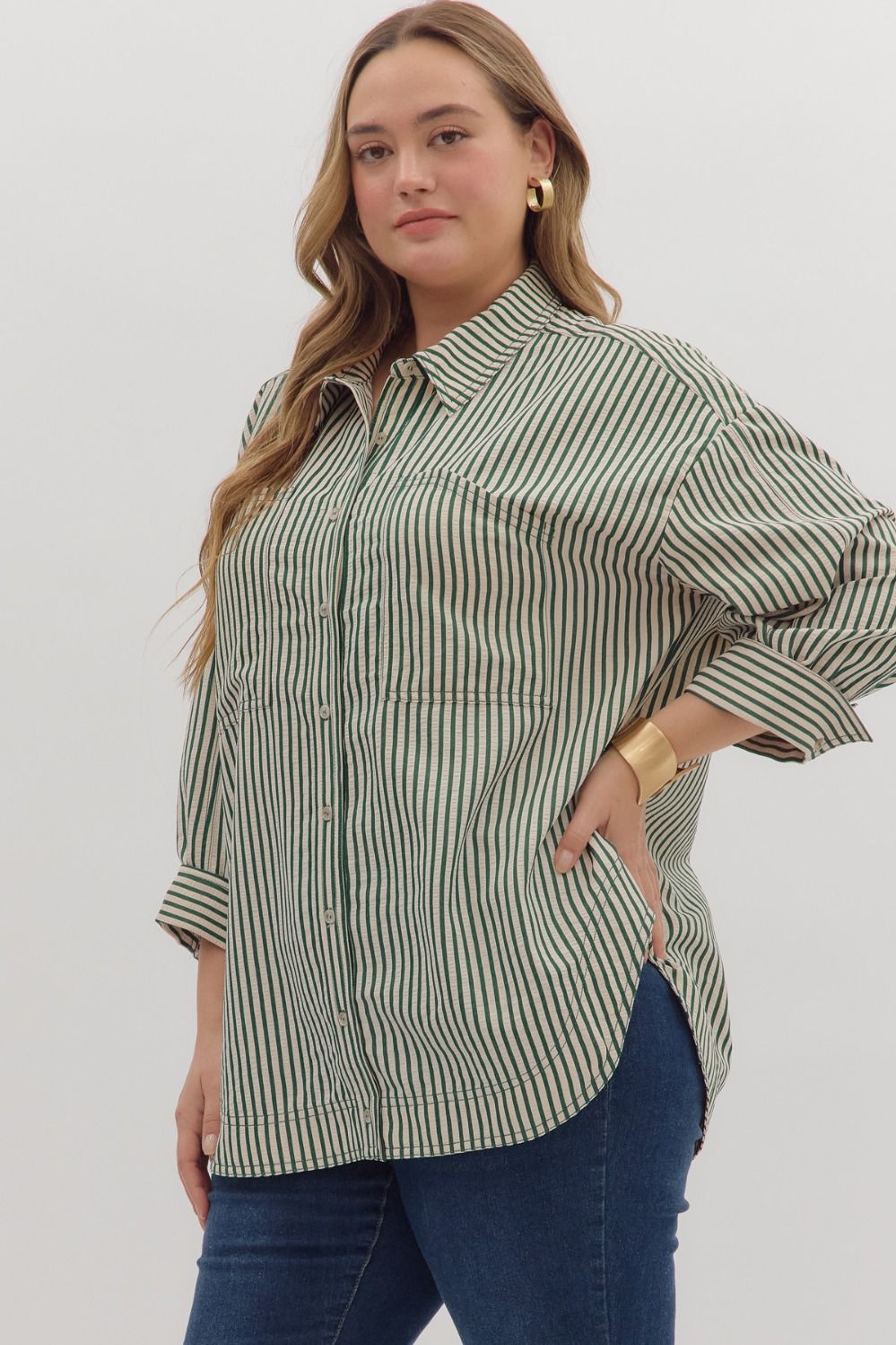 This green and white striped top features a unique textured stripe pattern and reverse cuff ¾ sleeves. With a button front design, this shirt is both stylish and comfortable. Perfect for a day at the office or a casual outing.