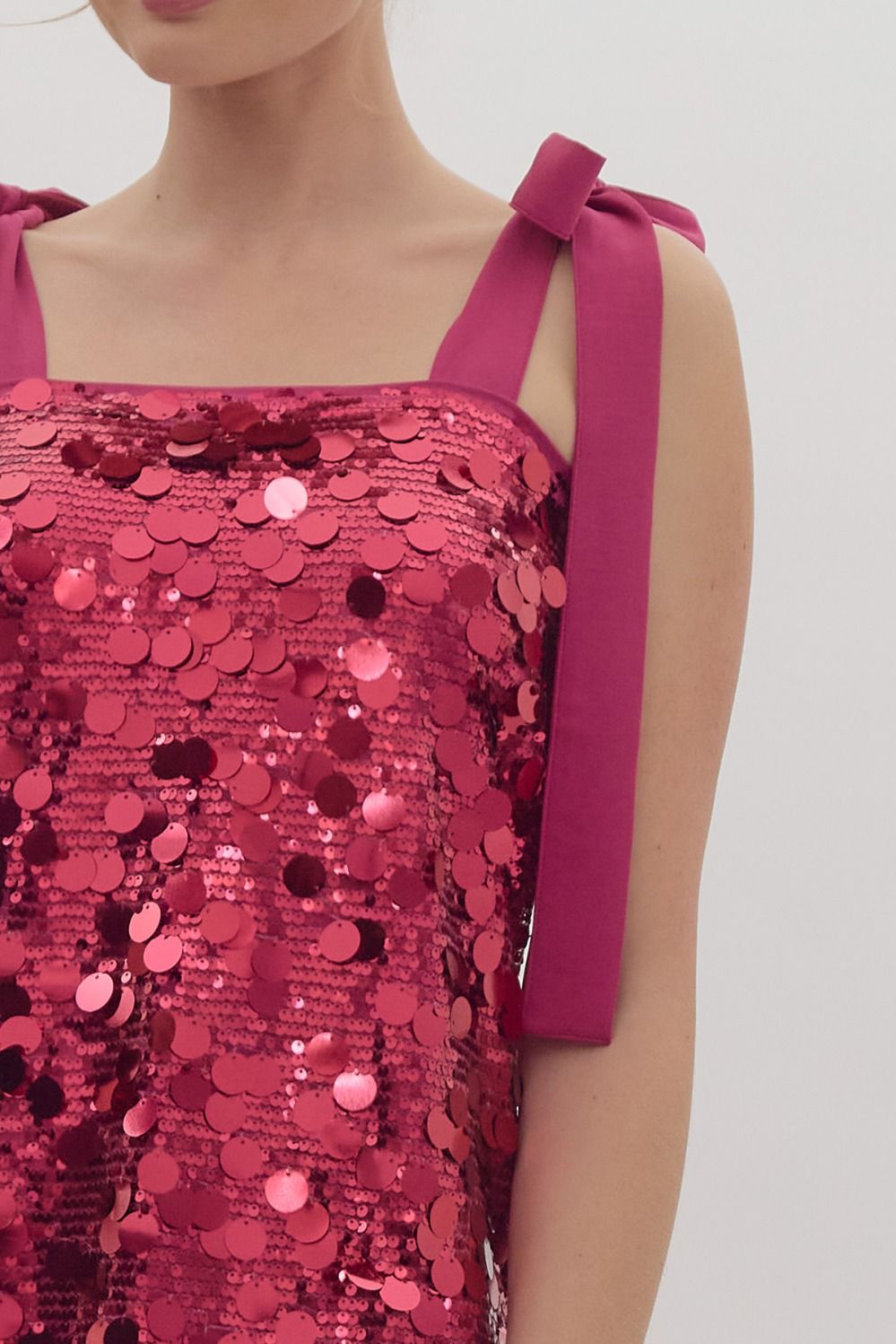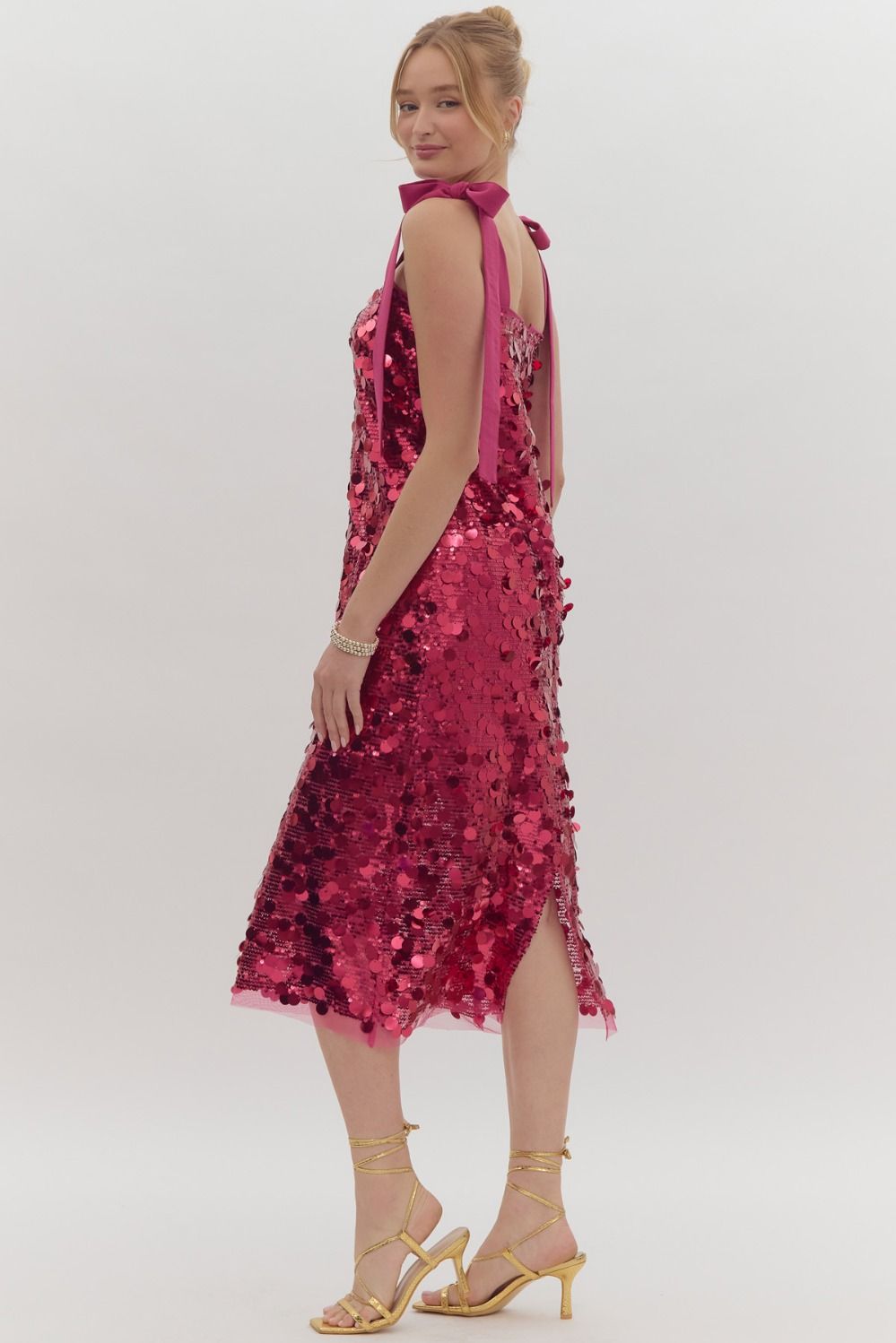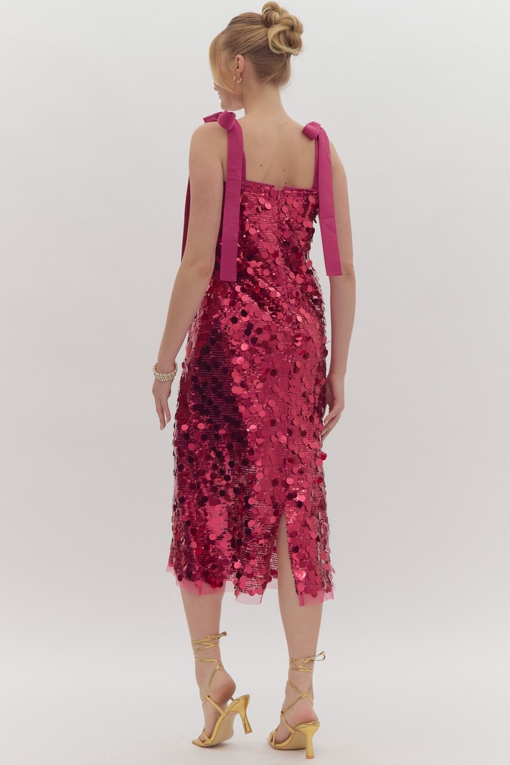 Brighten up any occasion with this dazzling Hot Pink Sparkle Dress! The hot pink spangles add a touch of glamour to the classic sheath design, while the kick pleat and adjustable shoulder ties provide the perfect fit. Perfect for a night out or a special event, this dress will make you shine!