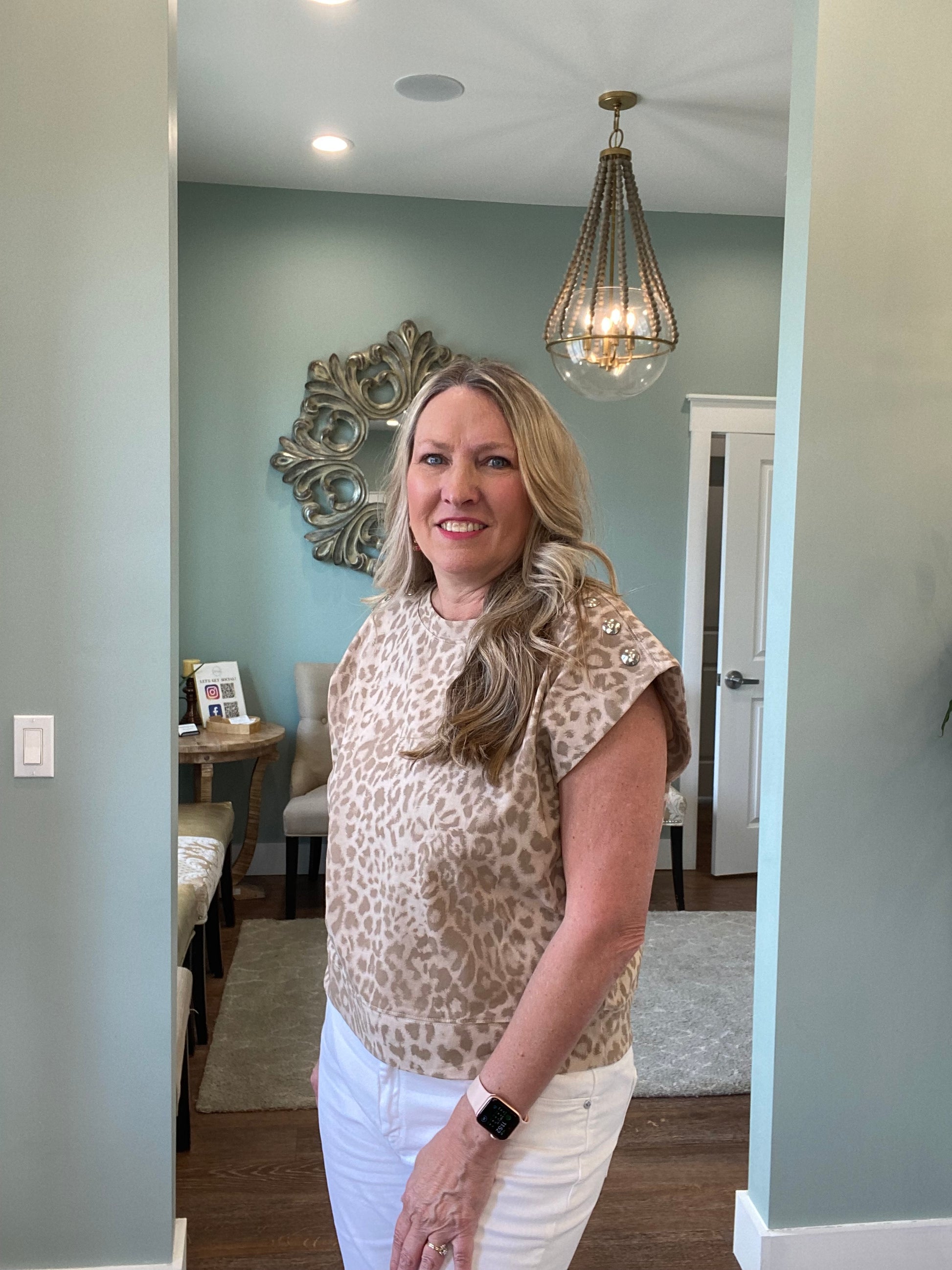 This tan leopard print top features a muscle sleeve and silver button accents at the shoulder for a touch of elegance. Embrace your wild side while staying stylish and comfortable. Perfect for any occasion.