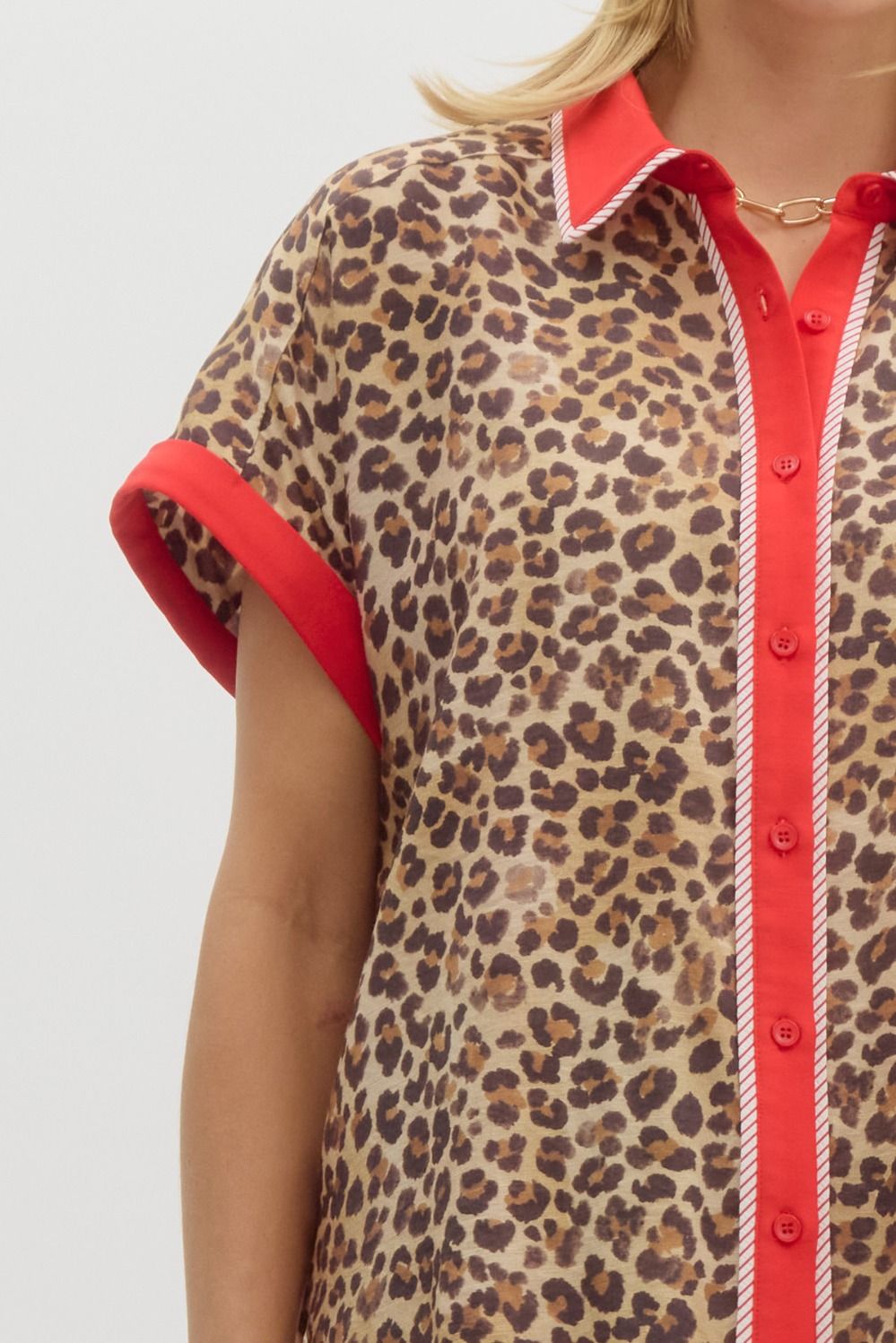 Dress to impress with our Lavish Leopard Top. This stylish top features a chic leopard print with red striping, making it a bold and eye-catching choice for any occasion. Its unique design adds a touch of sophistication to your wardrobe. A must-have for the fashion-forward individual.