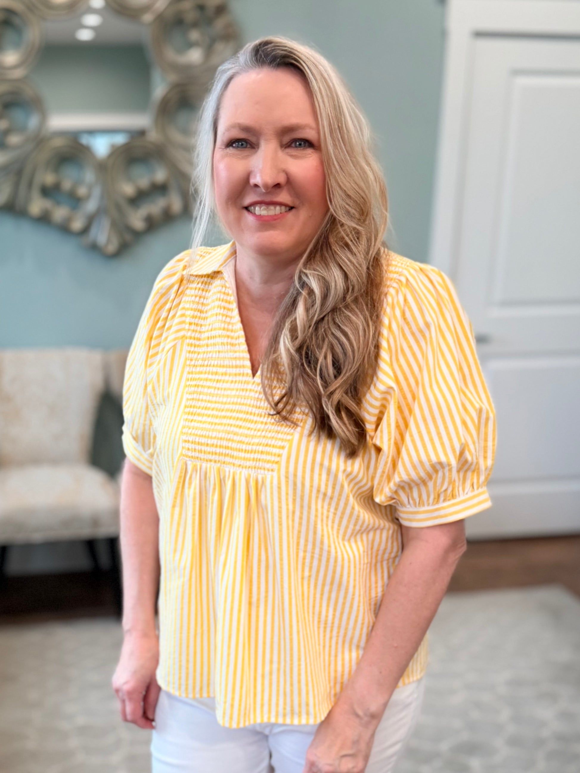 The Lemon Drop Top features a charming mini gingham print and a flattering collared v-neck that adds a touch of style to your casual wardrobe. With its relaxed silhouette and puff sleeves, you'll enjoy both comfort and a breeze of fresh fashion, making this top perfect for any occasion.