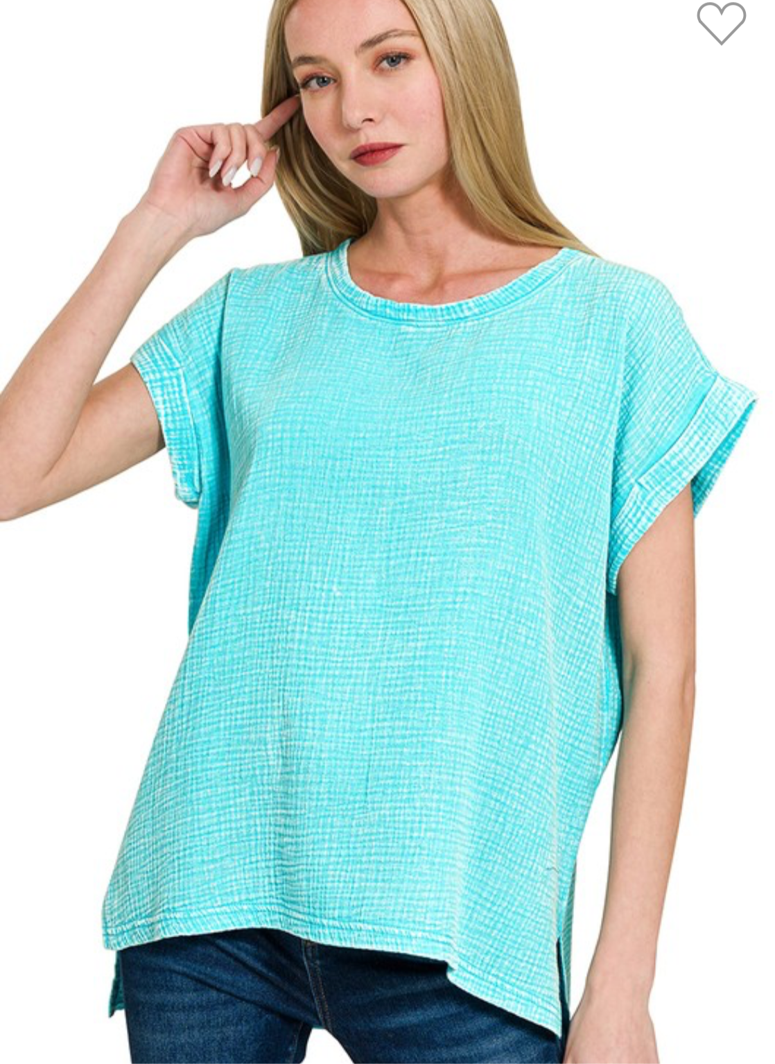 Stay comfortable and stylish with our Mint Sky Double Gauze Top! The round neck and short sleeves provide a relaxed fit, perfect for any occasion. Elevate your wardrobe with this must-have piece!