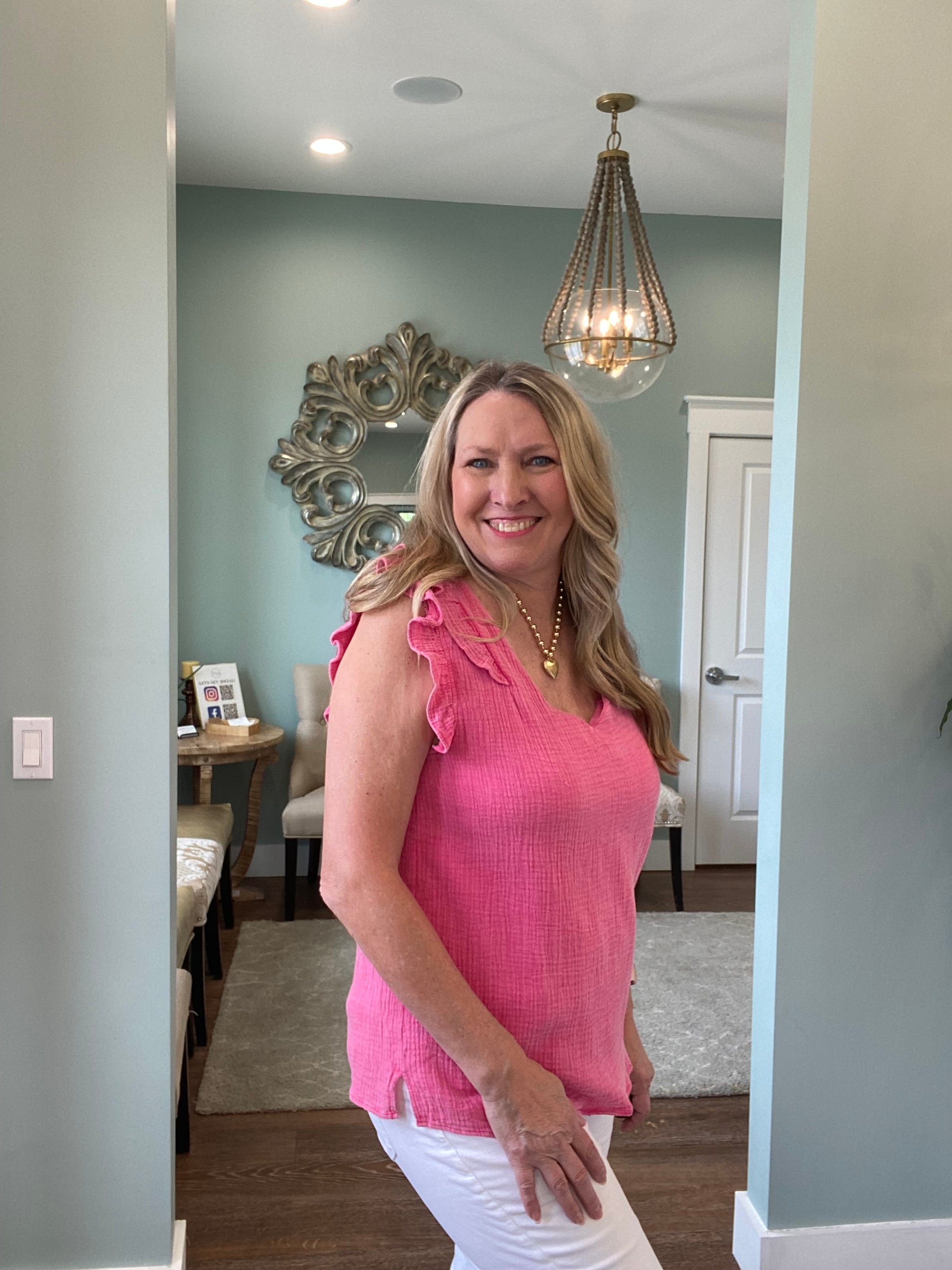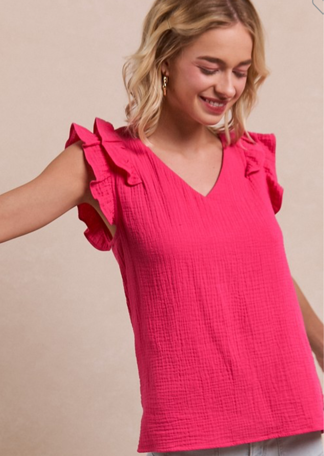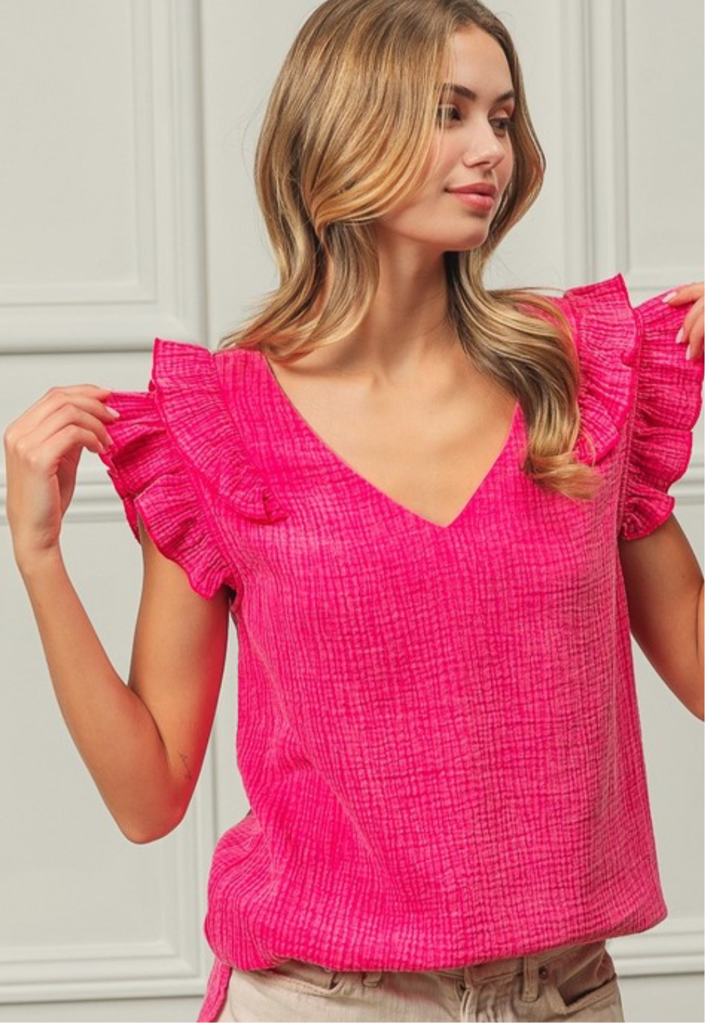 Be effortlessly stylish with our Pink Flutter Sleeve Top. Made from mineral wash gauze, it features playful flutter sleeves for a touch of whimsy. Embrace your carefree side and rock this top with confidence and flair.