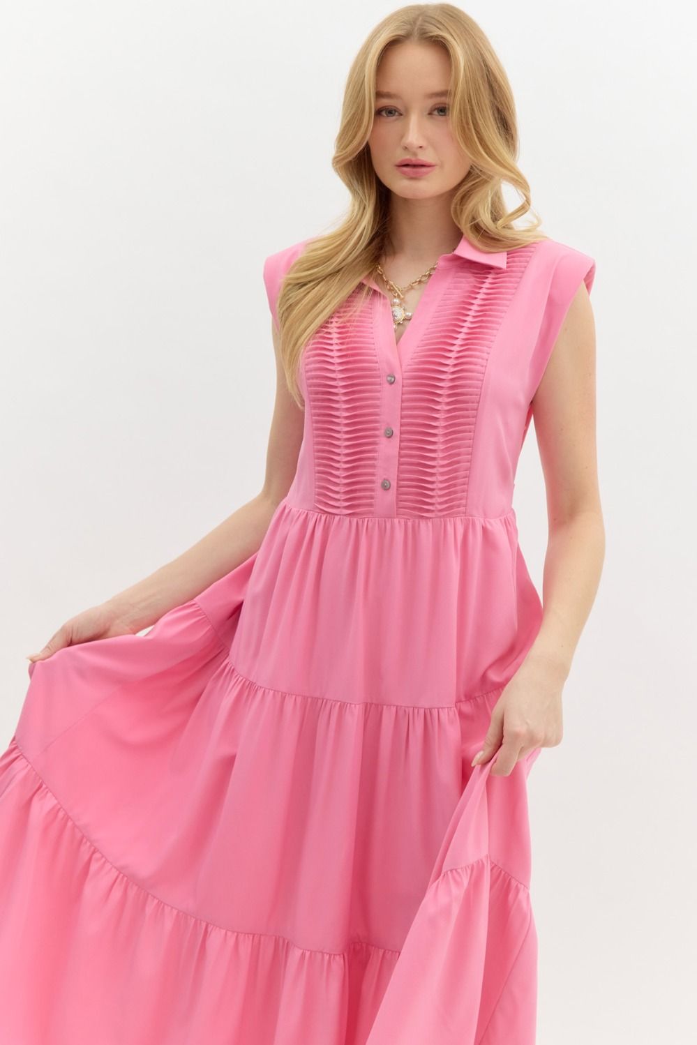 "Enhance your wardrobe with our Pink Pleated Dress. Featuring a pleated front and tiered skirt, this dress adds a touch of elegance to any occasion. The sash tie adds a flattering waistline to complete the look. Elevate your style with this versatile and chic addition."
