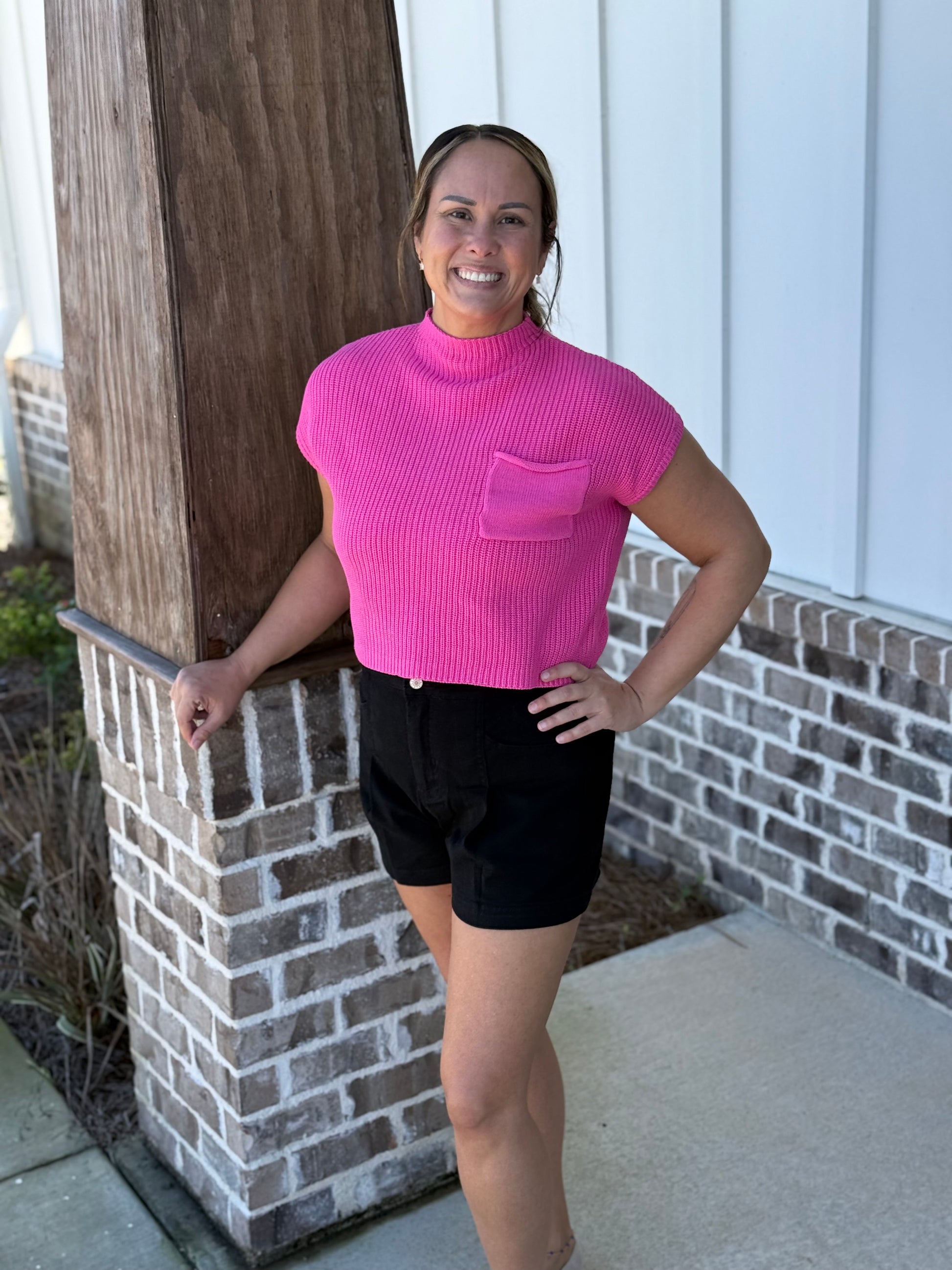 Introducing our Pink Short Sleeve Cropped Sweater - the perfect addition to your summer wardrobe! The cropped length and short sleeves provide a stylish and lightweight option for warmer days. The mock neck adds a touch of sophistication while the front pocket adds both style and convenience. Elevate your style with this must-have sweater!