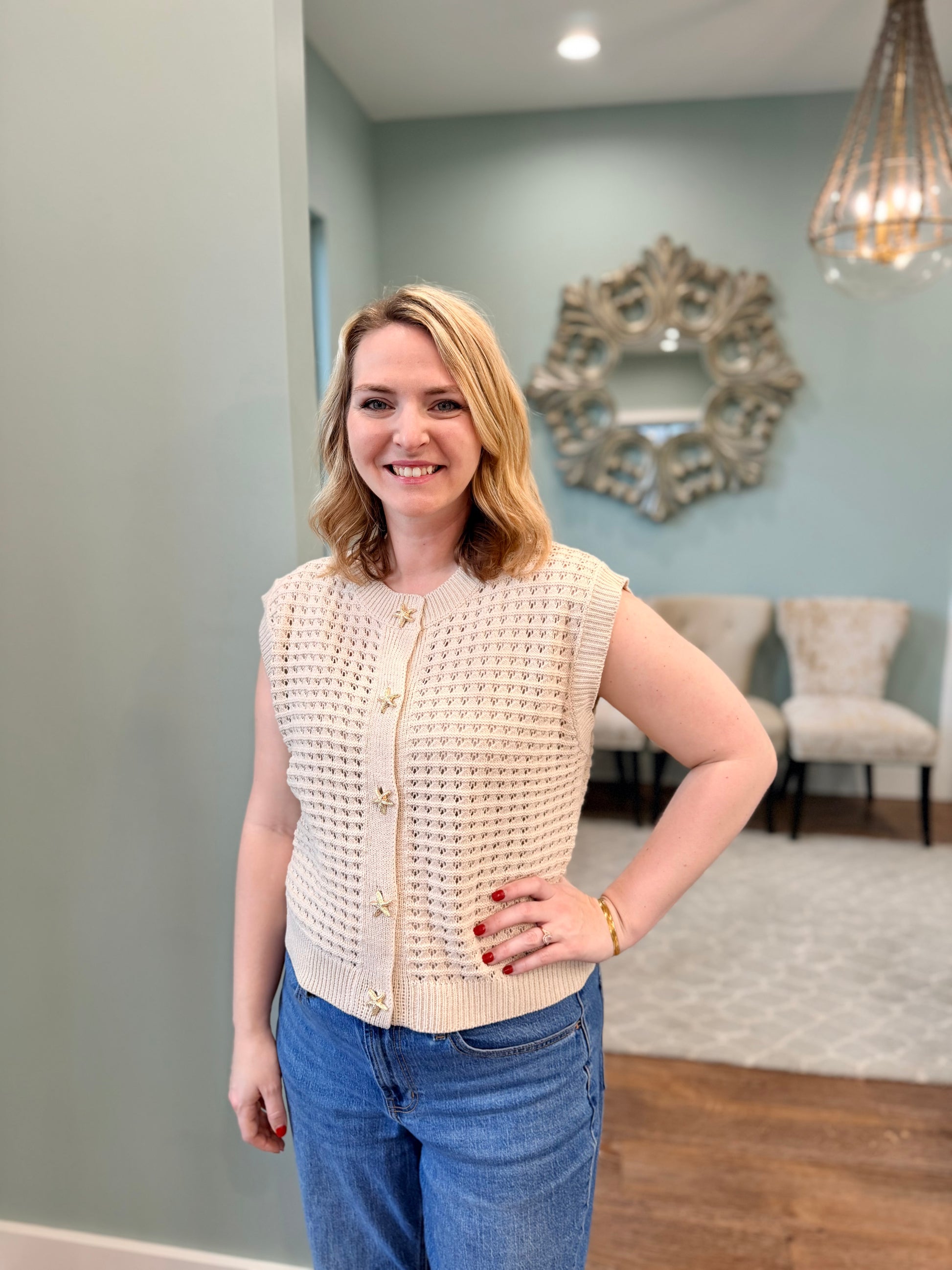Dive into comfy vibes with the Shell Open Weave Sweater! This taupe treasure brings a splash of style thanks to its gold seashell buttons—perfect for a beachy daydream (or just pretending you’re at a seaside café). Get ready to shell-ebrate your new favorite cozy companion!