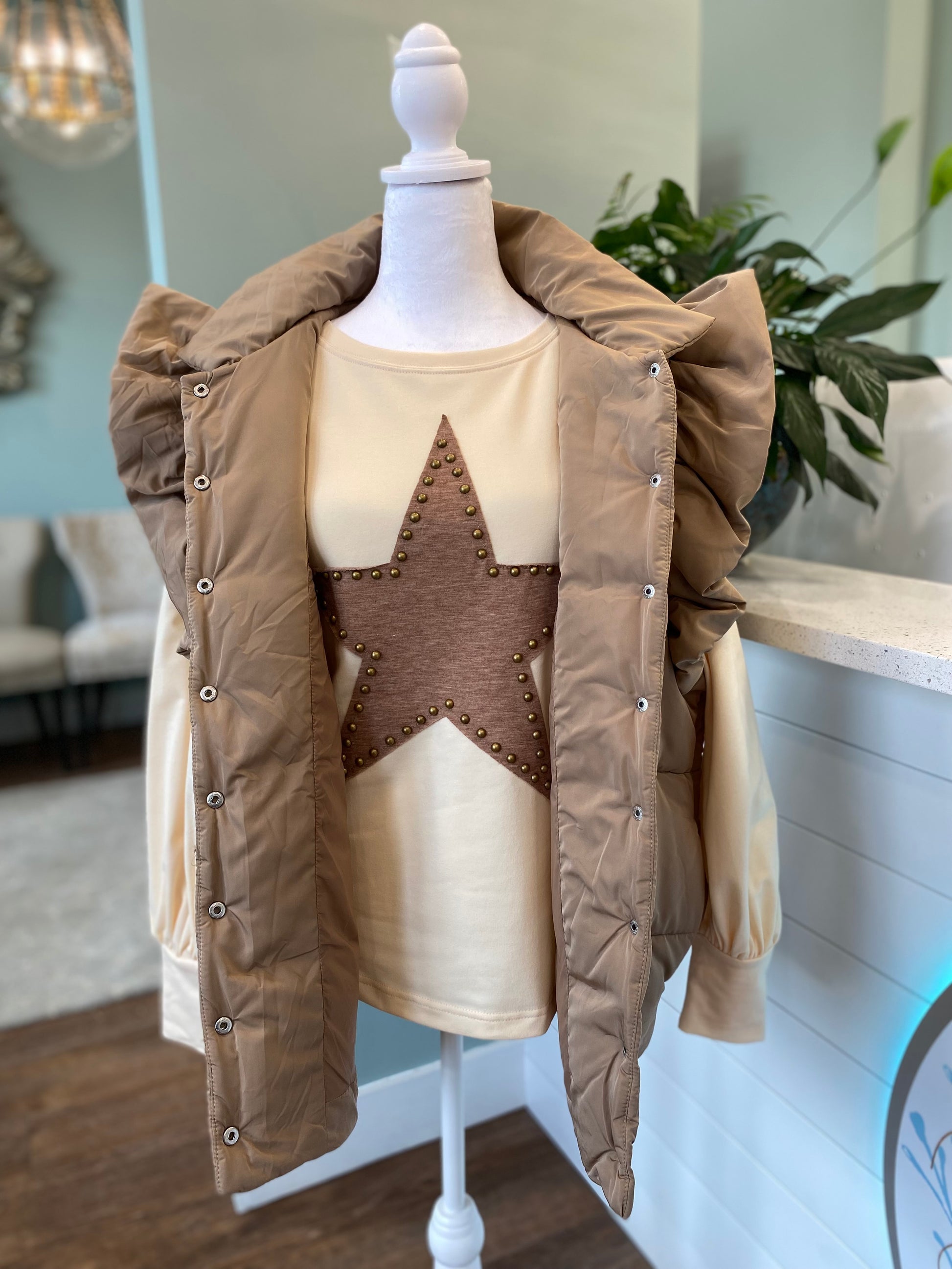 Experience the spotlight in our Star of the Show Top. The cream color and studded star design make you shine, while feeling comfortable and stylish. Stand out from the crowd with this stunning piece.