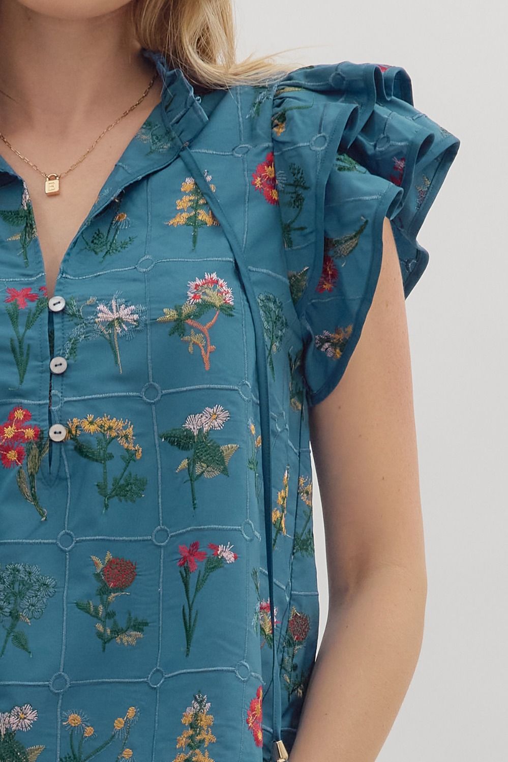 Elevate your style with our Teal Blue Floral Embroidered Top. It features beautiful embroidered flowers and a charming tiered flutter sleeve. The button front detail adds a touch of elegance to this casual top. Perfect for any occasion, this top will make you stand out in a crowd.