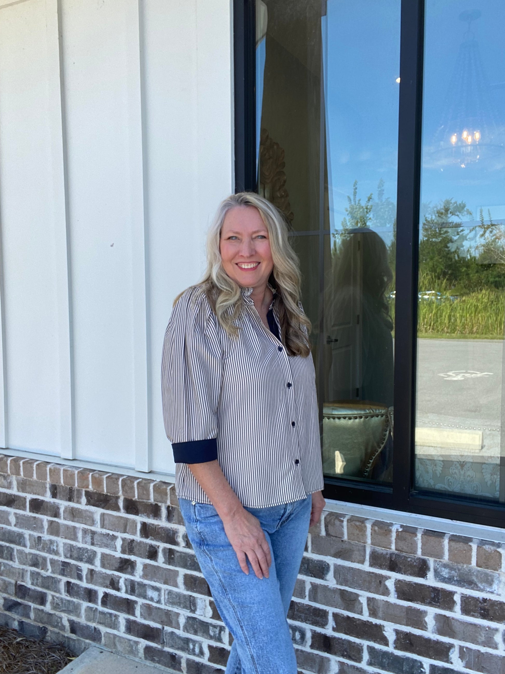 This navy striped 3/4 sleeve top features a charming ruffle neckline and contrasting cuff, adding a touch of elegance to your wardrobe. Made with high-quality material, it offers both comfort and style. Perfect for a day at the office or a night out, this top is a versatile addition to any outfit.